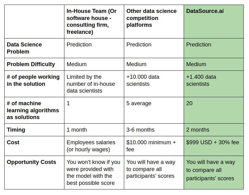 This same example applies if you plan to outsource this job to a software house that offers the machine learning service (it's only one company, not several competing to deliver the best model!) or if you try to hire a consulting firm, or if you want to hire a freelance. All of them have the same problem as an in-house data science team: you’ll only get a limited value.